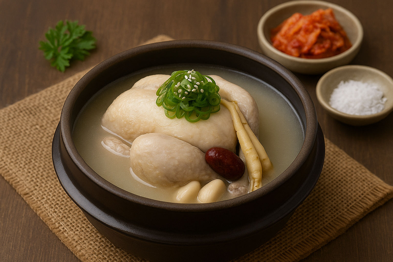 삼계탕은 어린 닭 한 마리를 통째로 사용해, 그 속에 찹쌀, 인삼, 마늘, 대추, 밤 등을 넣고 오랜 시간 푹 끓여 만든 보양식입니다. 이로 인해 국물에는 한약재의 향과 영양이 진하게 우러나며, 몸을 속부터 따뜻하게 해 줍니다.